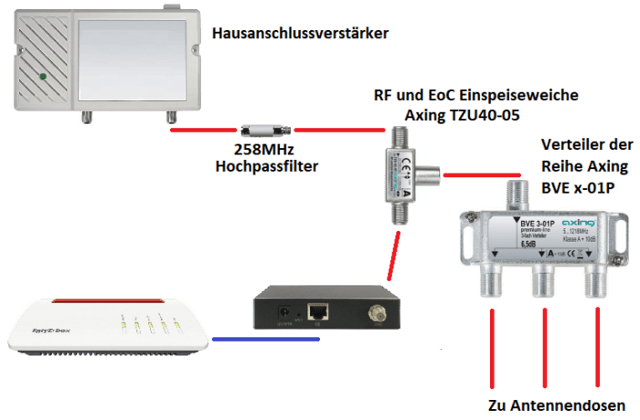 Die TV und Datensignale werden über eine RF/EoC Einspeiseweiche kombiniert. Um Störungen im Kabelnetz zu vermeiden, muss zusätzlich ein 258MHz Hochpassfilter eingesetzt werden. Der Filter wird üblicherweise am Ausgang des Hausverstärkers oder am Eingang der Einspeiseweiche angebracht.