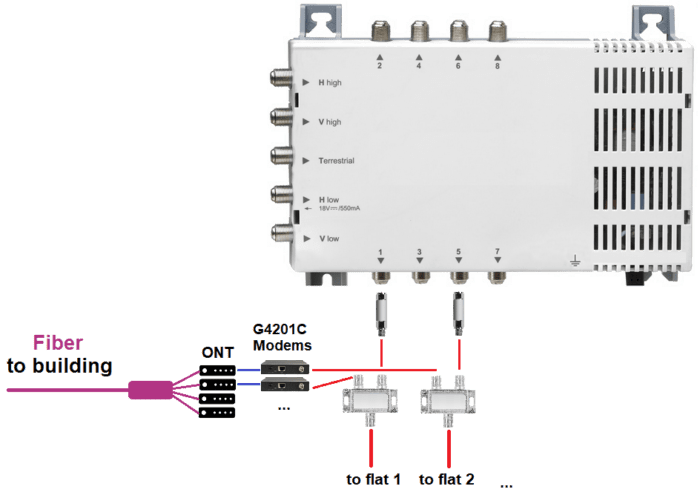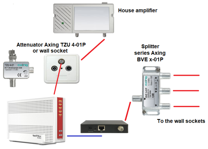 This sketch shows the connection including CATV channels in the 258-862MHz frequency range. To connect TV devices a multimedia wall sockets with selective TV port (258-862MHz) must be used, e.g. Axing BSD 967-nnX (DOCSIS 4.0/3.1) series or Braun Telecom btv-MMD-5nn-d(s) series.