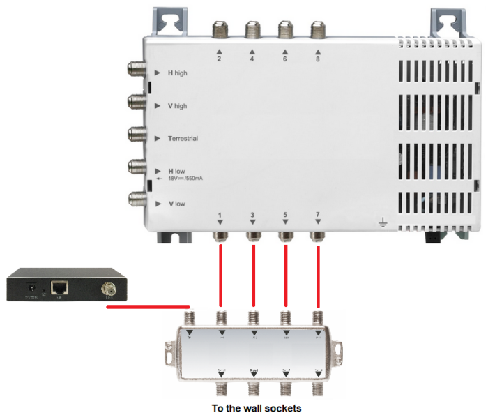 In addition, a SAT/TERR combiner is required. The cables from the LNB are routed through the combiner. This creates a fast data connection between all outputs. Several combiners can be connected to each other via their TERR inputs.