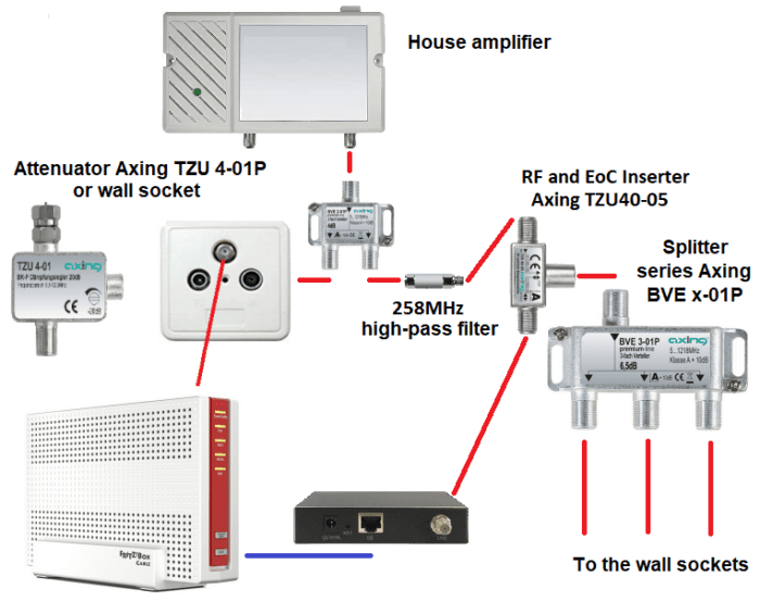 The TV and data signals are combined via an RF/EoC inserter. To avoid interferences in the cable network, an additional 258MHz high-pass filter must be used. The filter is usually installed at the output of the house amplifier or at the input of the coax splitter.