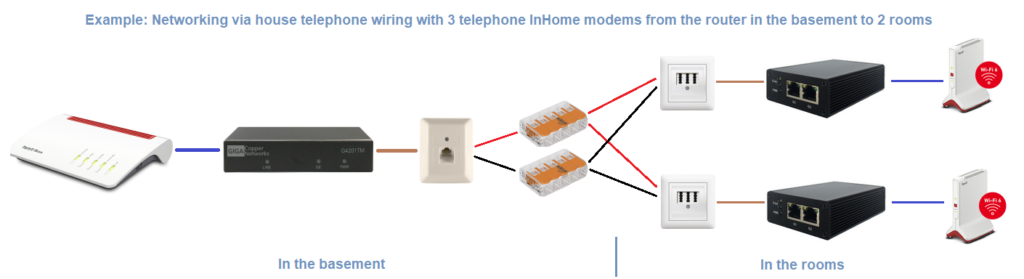 In addition, parallel operation of G.hn and analogue telephone signals is possible on one twin wire. Use the G4202T modems for this. These have an additional connection for analogue telephone devices and integrated splitters.